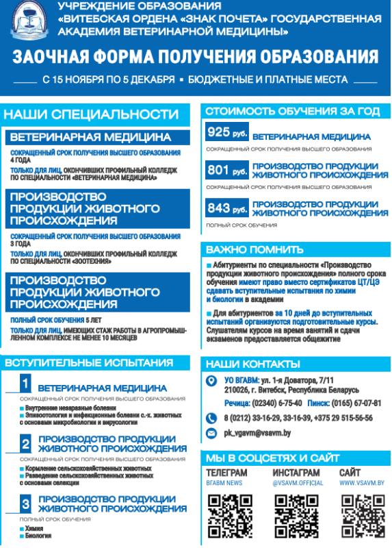 Учреждение образования «Витебская ордена «Знак Почета» государственная академия ветеринарной медицины» приглашает на заочную форму получения образования