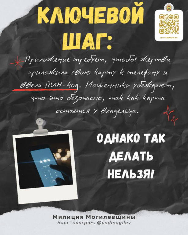 Приложение запрашивает, чтобы жертва приложила свою карту к телефону и ввела ПИН-код. Аферисты убеждают, что это безопасно, так как карта остается у владельца.