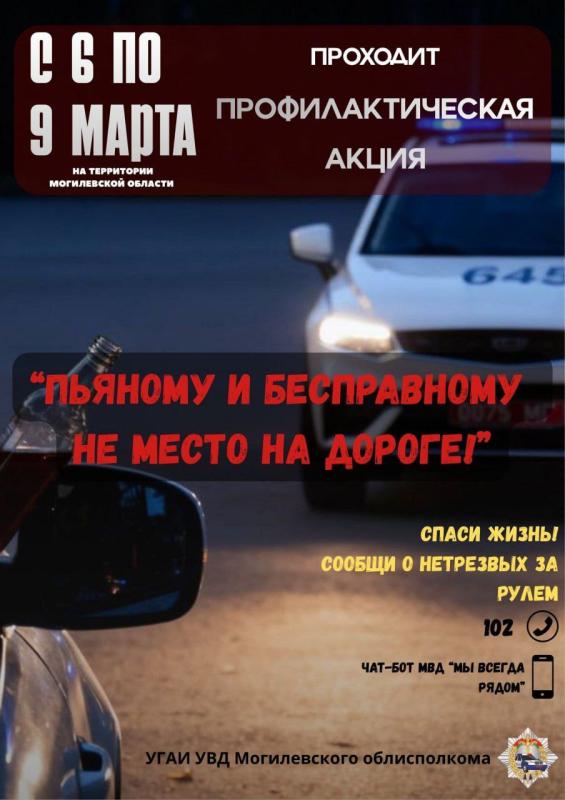 С 6 по 9 марта на территории Могилевской области будет проведено профилактическое мероприятие «Пьяному и бесправному не место на дороге!».